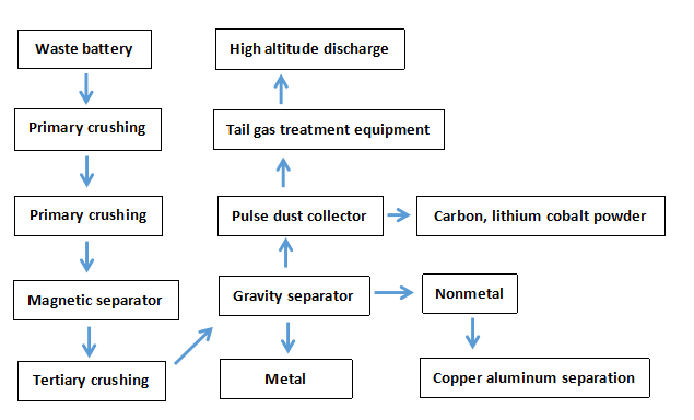 The pretreatment process of waste lithium ion batteries mainly comprises the following steps:afterdischarging the recovered waste batteries, crushing, magnetic separation, air separation,crushing, gravity separation, screening and other processes are carried out by mechanical equipment,so that the powder on the positive and negative pole pieces is effectively separated from thecopper aluminum foil, and the batteries are treated as valuable materials.