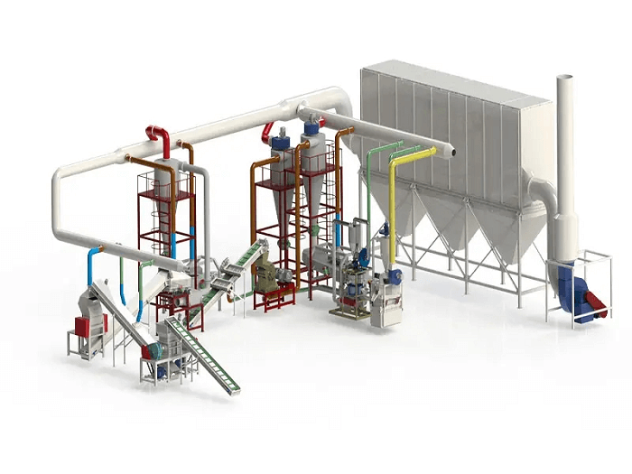 The entire production line of lithium battery recovery equipment is fed by conveyor materials into the crusher of the first process for coarse crushing. The coarse crushed materials are fed by conveyor to the secondary crusher for secondary crushing. The crushed materials from the secondary crusher enter the conveyor and magnetic separation equipment is installed to separate the iron in the materials. After the iron is removed by the material conveyor and magnetic separator, it enters the three crusher for fine crushing, crushing the material to powder. Materials in powder state enter the cyclone separator through the negative pressure system for air filtration, and then fall onto the air flow separator through the fan. The air flow separator separates materials of different densities to obtain metal separation, while all non-metals are brought into the pulse dust collector through the negative pressure system for concentration. The filtered tail gas will continue to be sent by the negative pressure system to the tail gas treatment equipment for air purification, so that it meets the national emission standards before being discharged at high altitude.