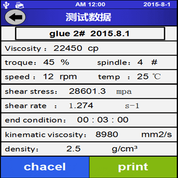 Up to 30 sets of data (including viscosity, temperature, rotor, speed, shear rate, shear stress, time, density, kinematic viscosity, etc.) |