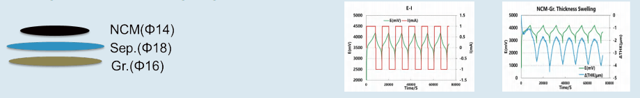 Assemble the NCM-Graphite LIB to test the thickness change during charge and discharge; test parameters: the current density is 0.6mA / cm2,2.8~4.2V;