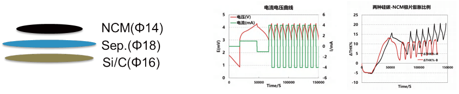 Assemble NCM-Si / C LIB and test the thickness change during charge and discharge; test parameters: