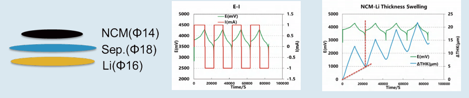 Assemble the NCM-Li half cell to test the thickness change during charing and discharging; test parameters: the current density is 0.6mA / cm2,3~4.3V;